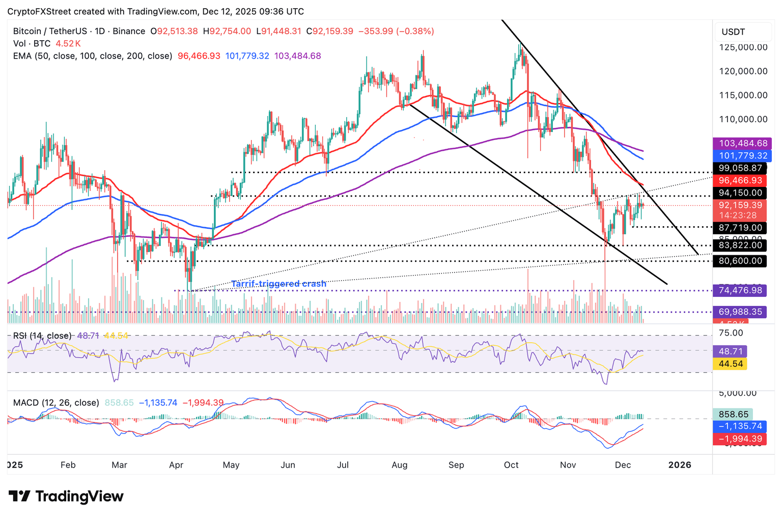 日线图上的MACD指标位于零轴下方的看跌区域,蓝色MACD线略高于红色信号线。几乎没有正值且呈收缩趋势的绿色柱状图表明动能中性。RSI指标为42,偏向看跌,暗示反弹可能有限。