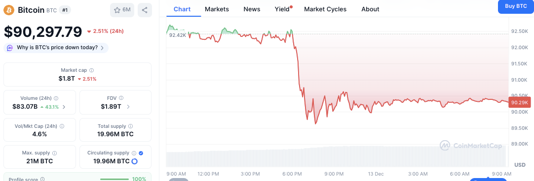 过去24小时内,比特币再次遭遇短期下行压力,下跌约2.5%,至90,300美元左右。图表数据显示,在尾盘抛售潮之前,比特币价格在92,400美元附近横盘整理,大部分时间都在该价位附近波动,尾盘一度跌破90,000美元。下跌期间交易活跃度有所提升,24小时成交量达到830亿美元。