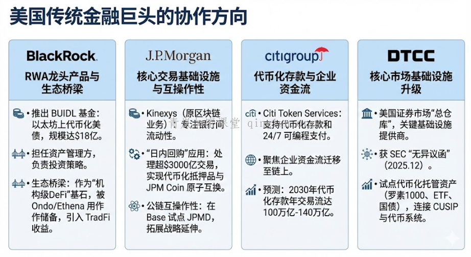 此外,美国货币监理署(OCC)与存管信托与清算公司(DTCC)等核心基础设施提供商的深度参与,构成了跨部门协同的基石,为贝莱德、摩根大通等巨头的实质性进场与系统整合提供了先决条件。