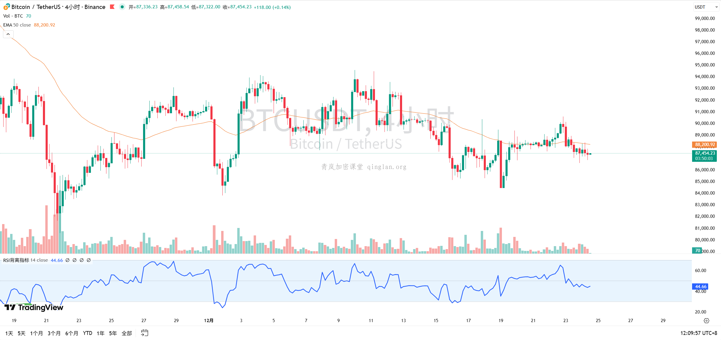 . 4小时线(4H):偏弱向下。最新价87319.55美元,区间高点89945.43美元,低点84483.79美元。短期趋势没有好转,没能形成有效的反弹动能。