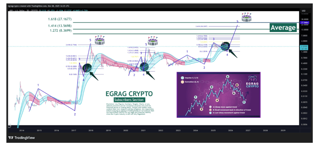 尽管整体增速放缓技术分析显示,XRP 的价格走势图仍然展现出稳健的结构。维持关键支撑水平。据以对 XRP 进行长期技术展望而闻名的知名分析师 Egrag Crypto 称,该代币可能很快将进入迄今为止最具爆发力的第五波浪潮。
