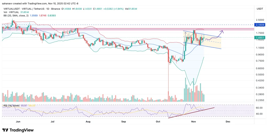 经历了强劲的十月之后,虚拟协议 (VIRTUAL) 价格看起来有望在11月迎来强劲上涨。价格目前处于牛旗形态内,表明在延续上涨之前会进行健康的盘整。相对强弱指数(RSI)正攀升至上轨附近,表明买盘力量正在增强,而布林带收窄则暗示未来波动性将大幅扩大。如果VIRTUAL突破关键阻力位1.5美元,则该形态可能得到确认,并触发一波向1.8美元的上涨行情,预示着本月看涨势头将再次增强。