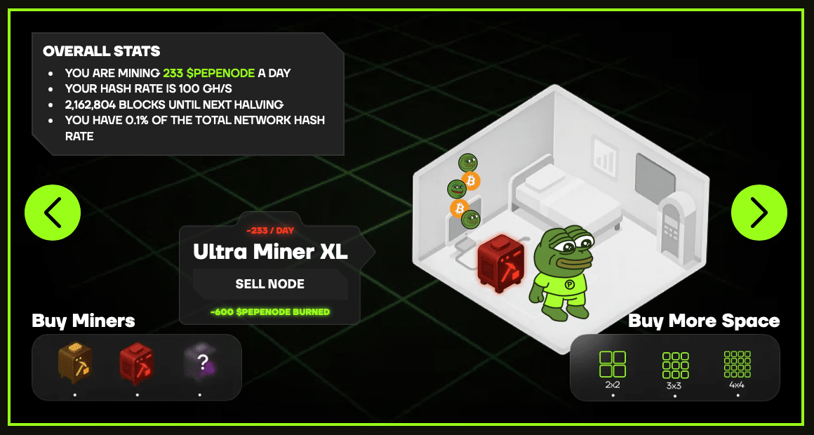 同样的 PEPENODE 代币也可用于升级您的虚拟服务器机房和改进设备,将您的系统改造成更高效、高收益的挖矿机器——所有这些都无需实体矿机或承担额外的电力成本。这就像在 FarmVille 游戏中扩大您的地块种植更多作物一样,只不过这次您收获的是真正的加密货币。