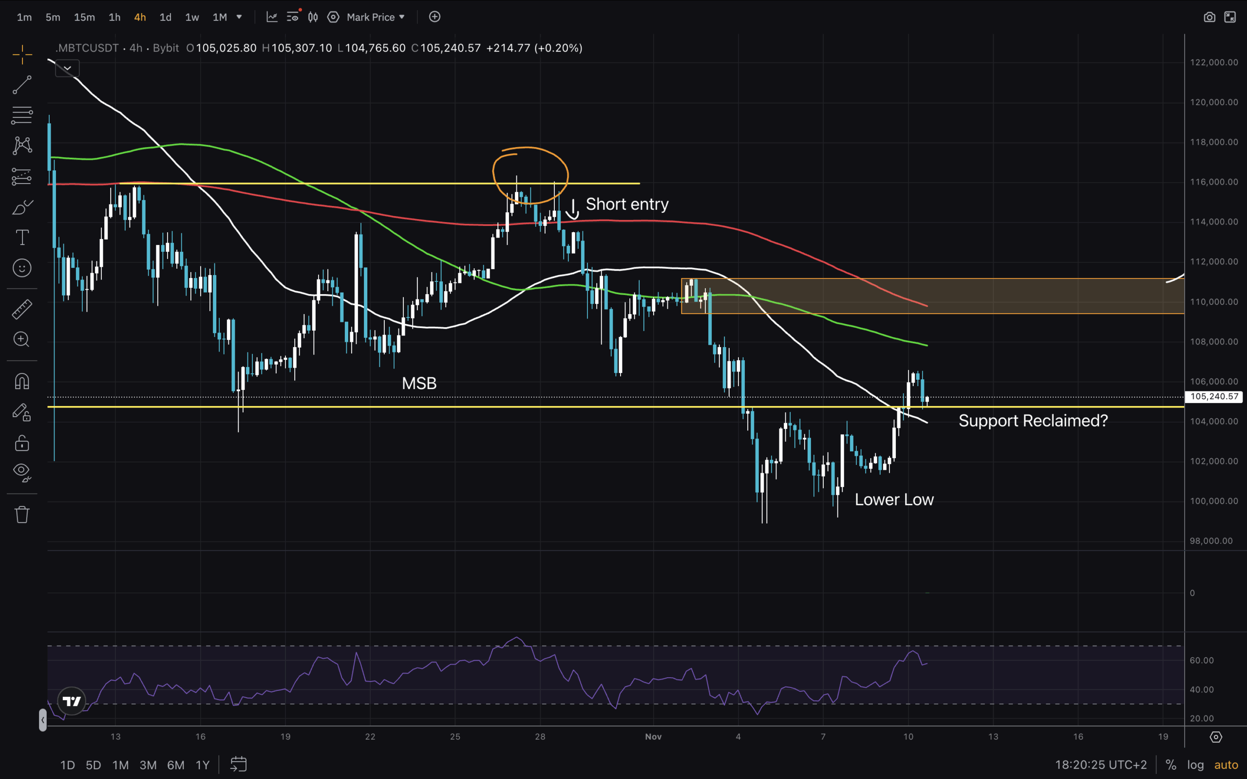 对于交易者来说,了解如何在市场双向交易至关重要。在这张4小时图上,我们可以看到一个绝佳的做空机会。我标记了SFP之后形成的高点。一旦116,000美元的阻力位被拒绝,价格再次跌破200日均线,这就是我们的入场点。入场点位在112,500美元附近,止损位设在116,000美元。轻松获利2倍,直至触及105,000美元的支撑位,然后继续下探至更低的低点,再获利3倍以上。