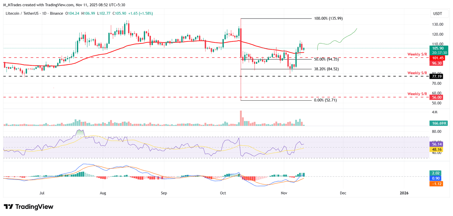 周二,莱特币 (LTC) 价格呈现复苏迹象,交易价格接近 105 美元,市场整体看涨势头强劲。链上和衍生品数据显示,投资者信心增强,交易量增加,资金费率为正,大户也纷纷加仓。技术面也支持价格进一步上涨,动量指标持续走强。