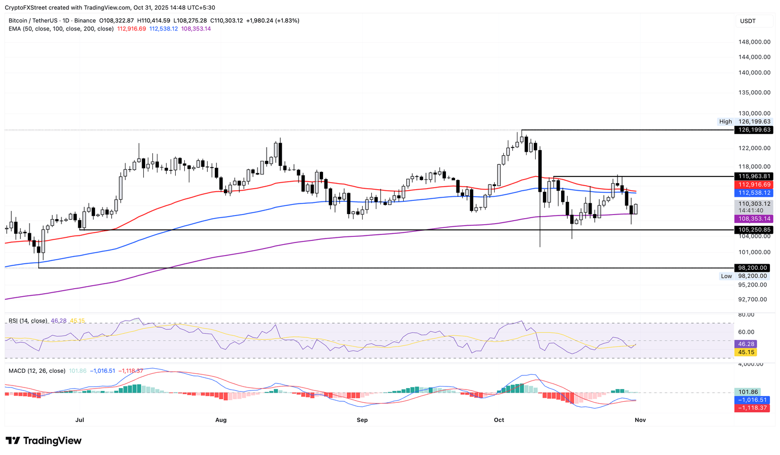 截至周五发稿时,比特币交易价格约为 11 万美元,在 200 日均线 108,353 美元处获得支撑。如果当日收盘价上涨,将结束连续四个交易日的下跌趋势,并可能引发反弹,目标直指 100 日均线 112,538 美元。