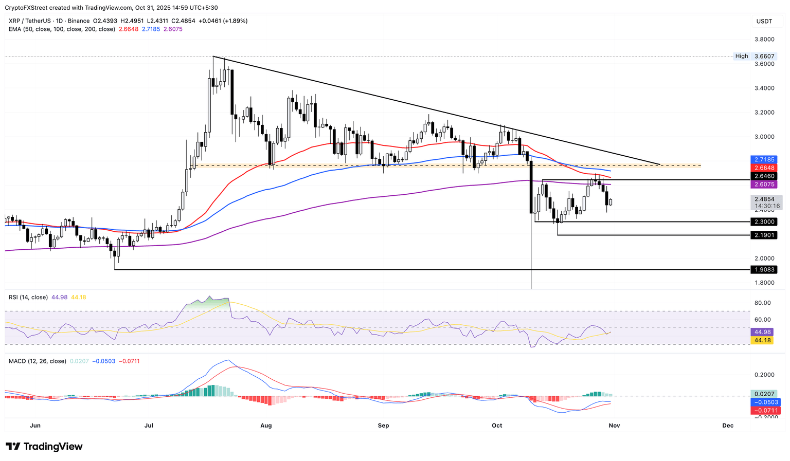 从下方看,XRP 的关键支撑位在 2.30 美元和 2.19 美元,分别对应 10 月 11 日和 10 月 17 日的低点。