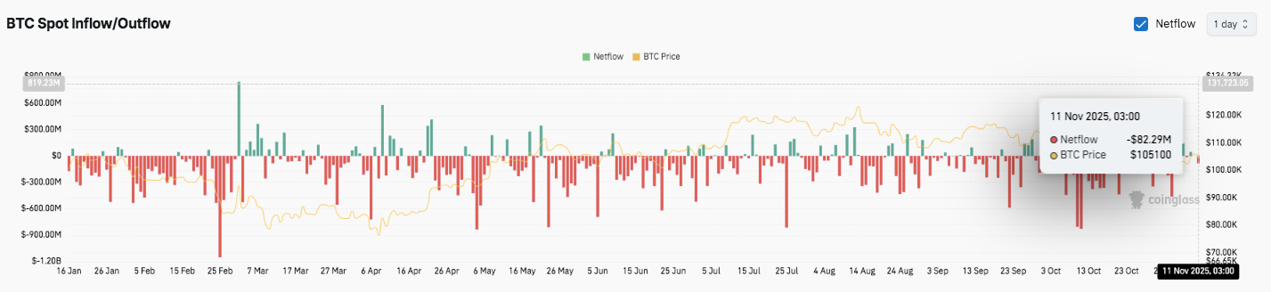尽管衍生品市场情绪乐观,但现货市场数据却呈现出更为谨慎的景象。11月11日,比特币现货产品录得8229万美元的净流出。这标志着自10月下旬以来持续的负增长趋势仍在继续,表明各交易所持续面临抛售压力。
