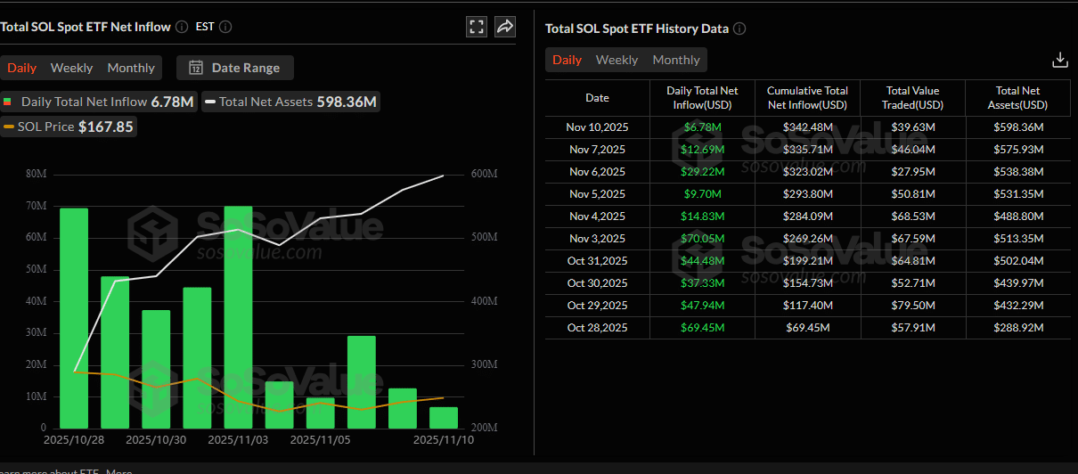 自10月28日两只现货Solana ETF推出以来,资金流入从未间断。美国机构投资者累计买入近6亿美元的现货Solana ETF。仅昨日,就有超过670万美元的现货Solana ETF被买入,其中大部分是通过Bitwise平台完成的。