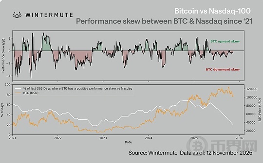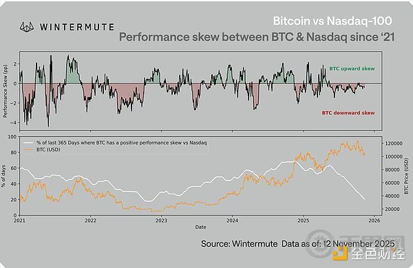 我们通过比特币与纳斯达克100指数之间的表现偏差来衡量这种关系,即比特币在纳斯达克下跌日的跌幅比在上涨日的涨幅大多少。