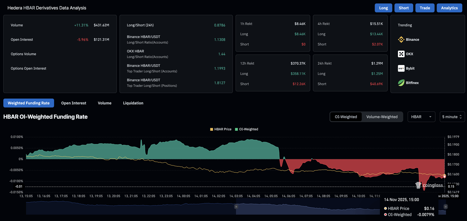 截至周五发稿时,Hedera (HBAR) 价格下跌 4%,跌破 0.1600 美元的关键支撑位,面临高达 20% 的更大幅度回调风险。衍生品数据显示,随着 HBAR 期货未平仓合约量暴跌和融资活动减少,交易员情绪趋于悲观。利率反转负片。