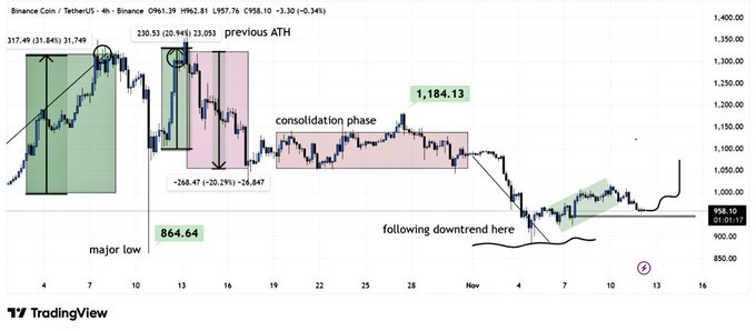在经历了一段较长时间的下跌之后,BNB 价格在 864 美元附近创下了一个大低点。