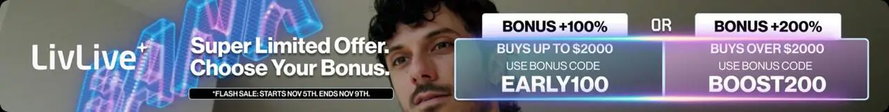 当前市场低迷促使 LivLive 推出这项奖励活动。LivLive 将预售窗口定位为在不确定时期增强实力的机会。所有参与者均可享受同样的 96 小时优惠:使用优惠码 EARLY100 即可获得 100% 的奖励。BOOST200更有高达200%的额外奖励。此优惠活动于周三开始,让早期买家在未来的价格波动中占据有利的先机。