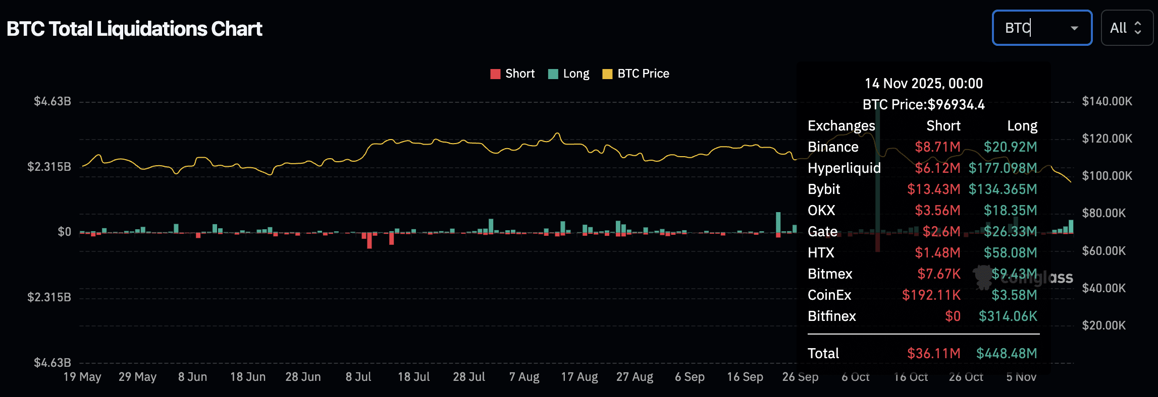 杠杆交易者付出了代价,各大交易所共计4.4848亿美元的多头头寸被强制平仓。Coinglass 数据.