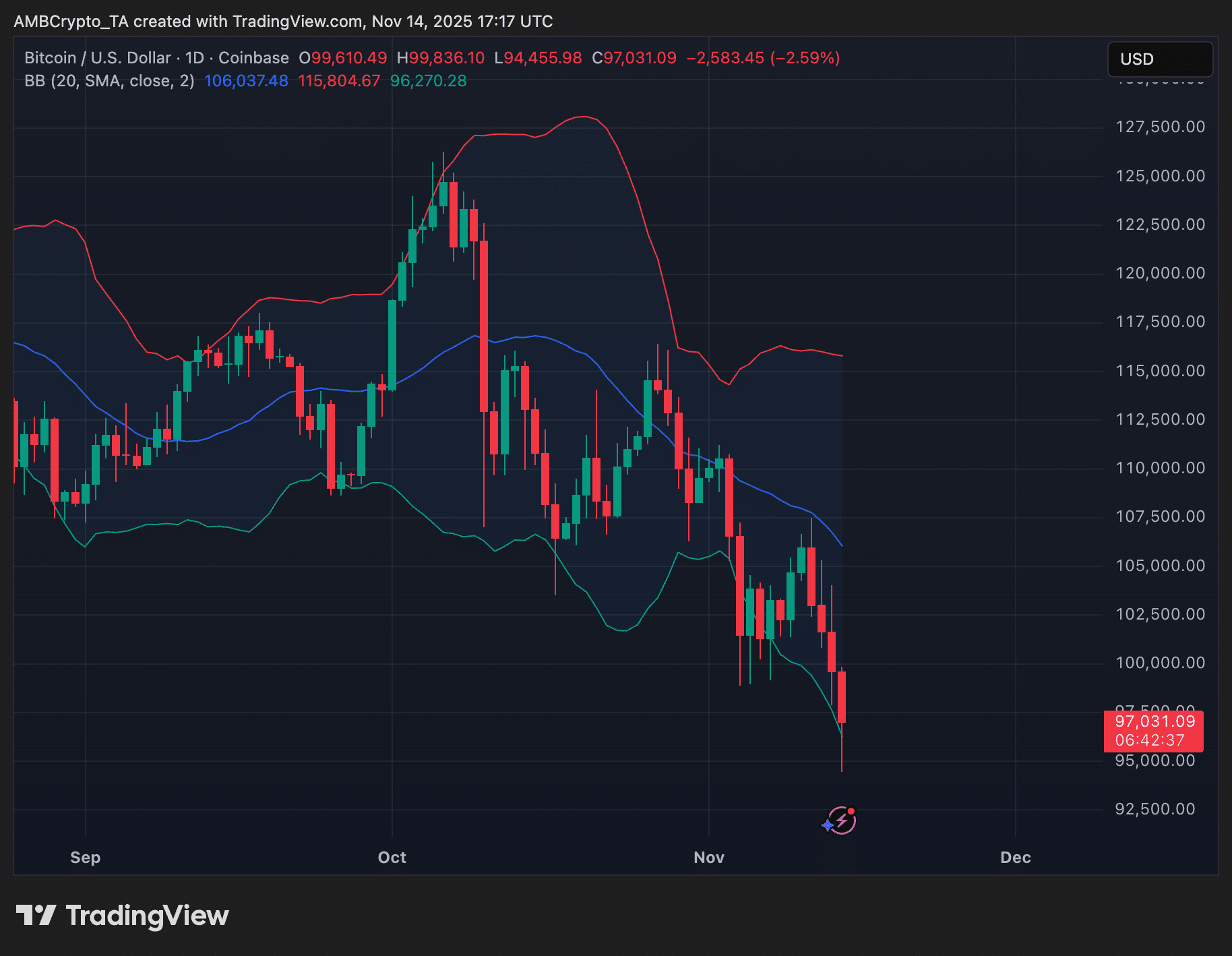 11 月 14 日,比特币跌至 97,031 美元,跌破关键的 100,000 美元关口,较 10 月份创下的 126,000 美元历史最高点下跌了 23%。
