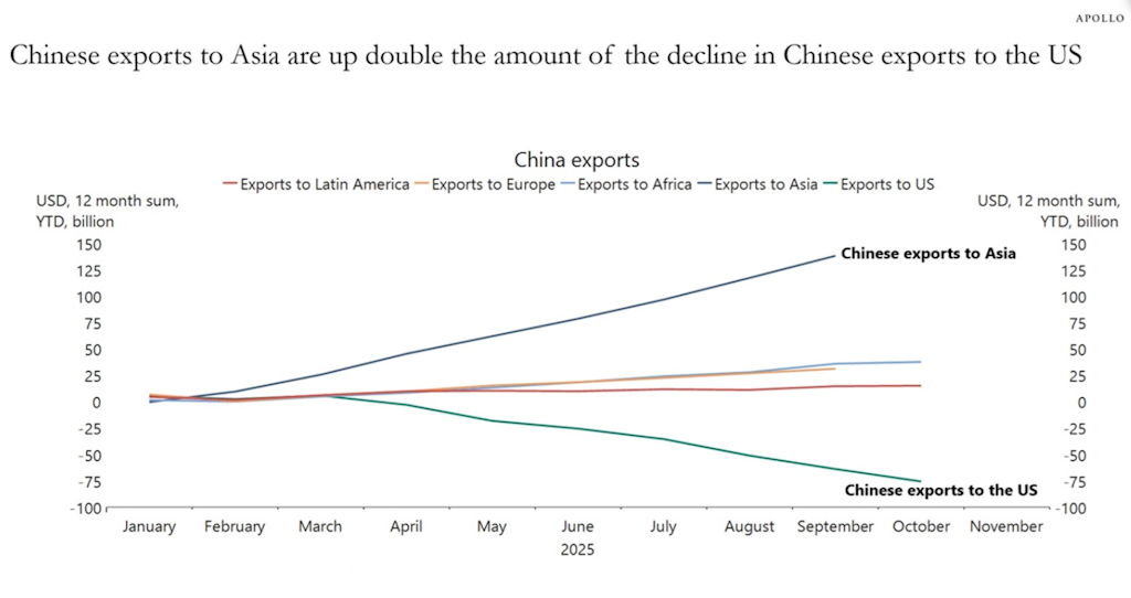 托斯滕·斯洛克指出,虽然今年迄今为止中国对美国的出口额减少了 750 亿美元,但对亚洲的出口额却增加了 1500 亿美元。