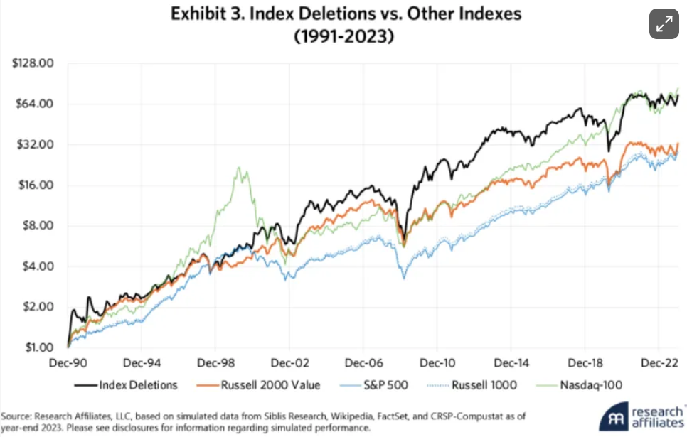 大卫·海笔记从 1990 年到 2022 年的 32 年间,标普 500 指数(上图中的黑线)下跌的股票每年跑赢该指数 5%,累计超额收益达 400%。