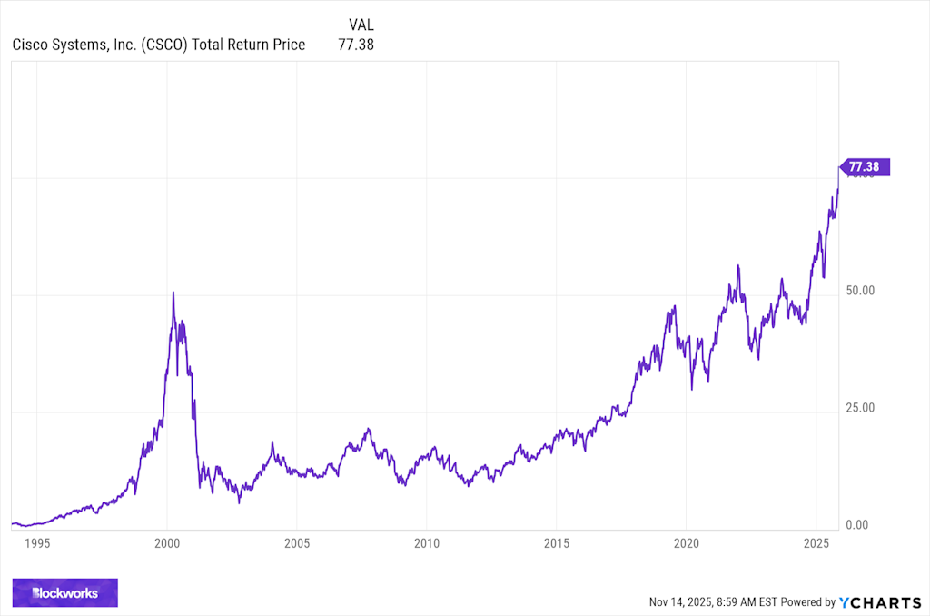 思科股票——在 2000 年被认为已经死亡并被人们遗忘已久——现在总回报率(股息再投资)比其互联网泡沫时期的峰值高出 50%。