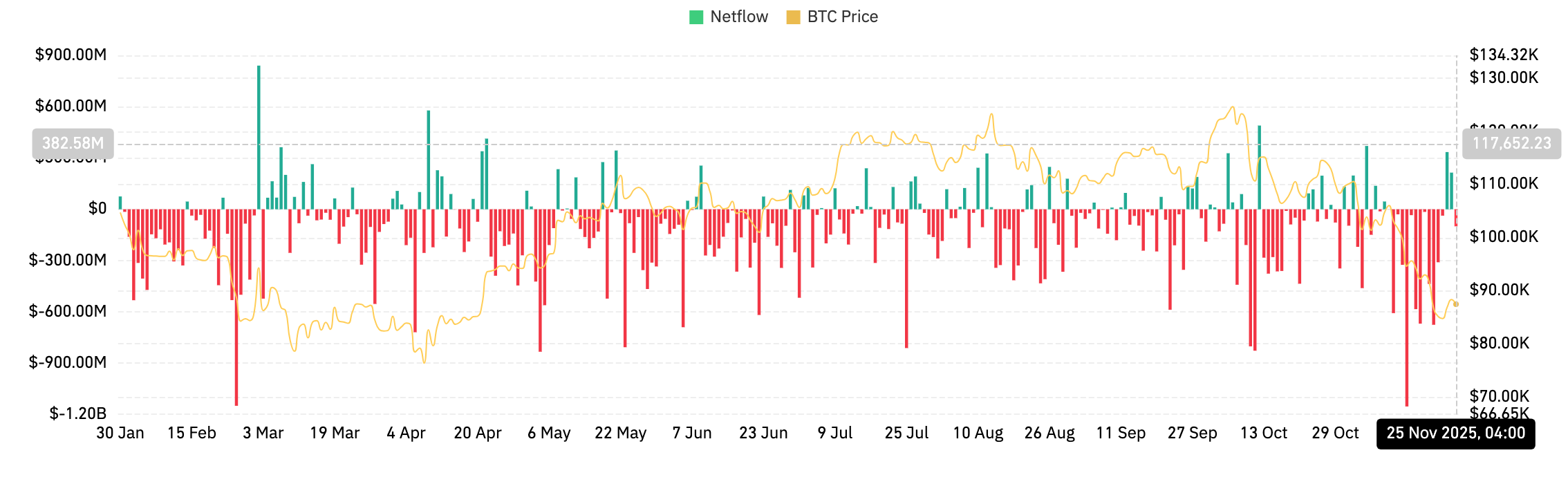 这种分布偏差自11月初以来就已显现。每次试图回升至9万美元以上都会遭遇新一轮资金流出,表明市场情绪依然谨慎。