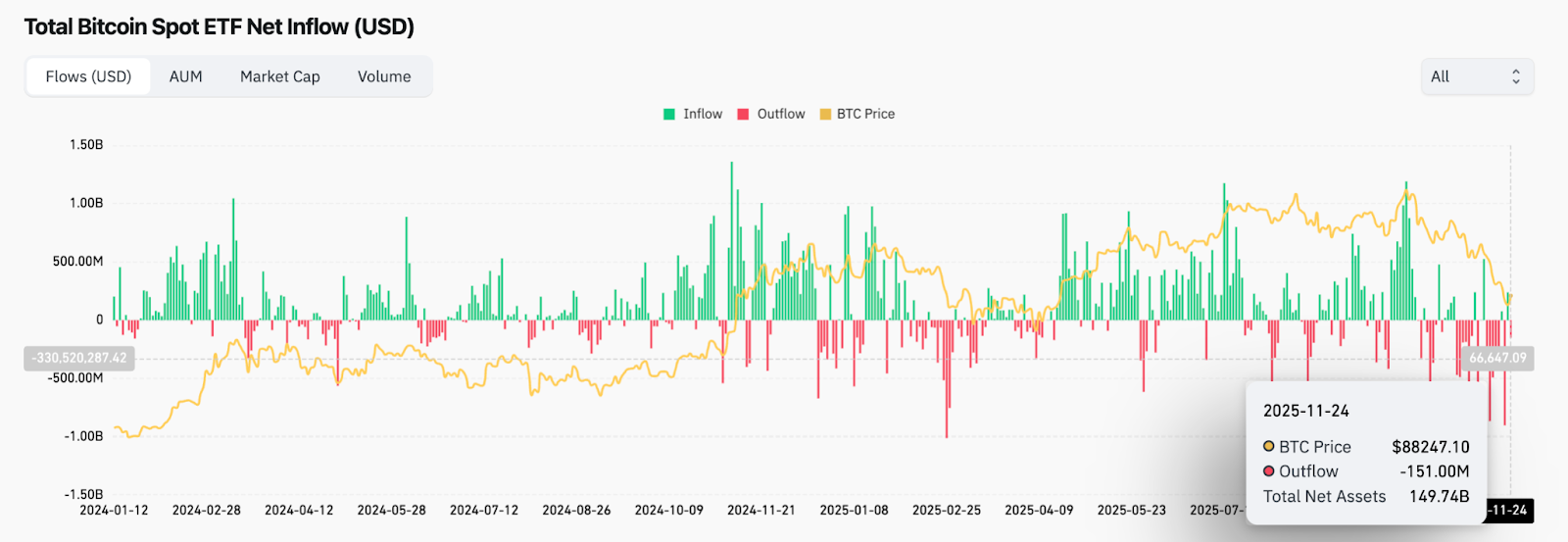 比特币现货ETF的资金流动又加剧了这一压力。11月24日,ETF录得1.51亿美元的资金流出。这与过去两周的整体趋势相符,即赎回量超过流入量,导致现货市场流动性下降。