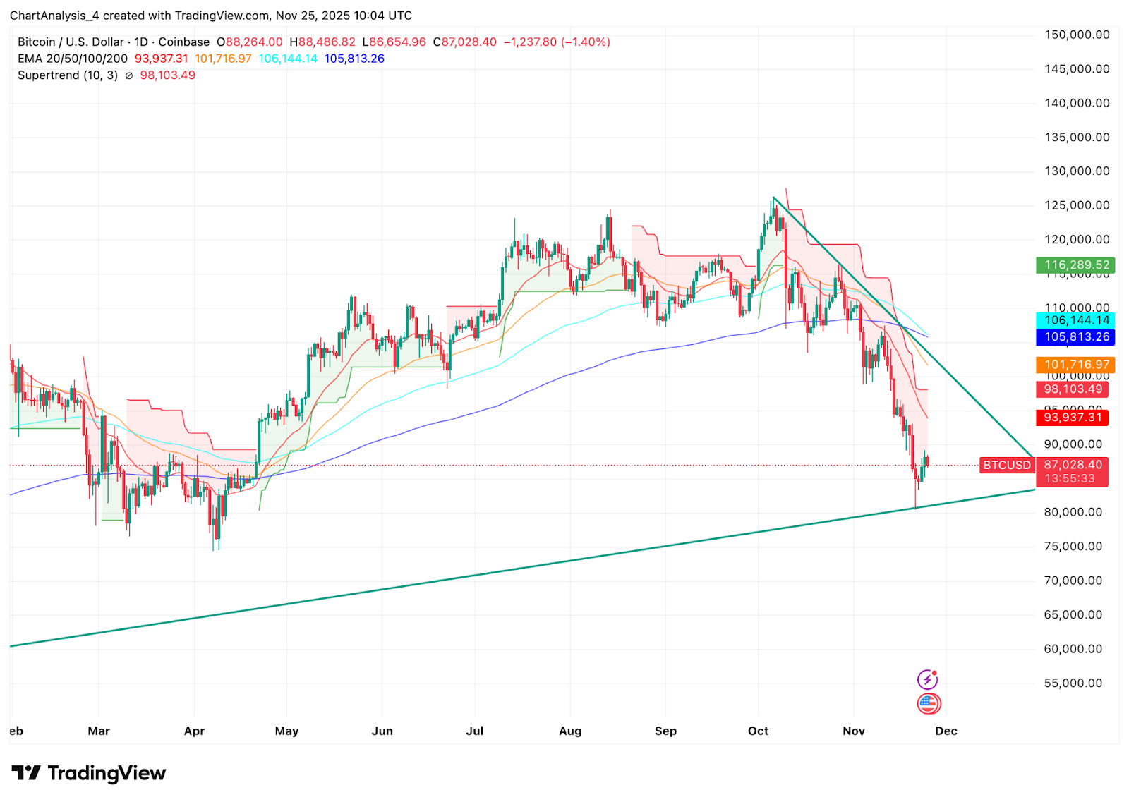 自 2023 年初以来的长期上升趋势线目前是关键支撑位。价格近期在 86,000 美元附近从该区域反弹。如果买家守住这条趋势线,即使短期动能疲软,比特币仍能维持更广泛的上升趋势。如果价格彻底跌破该趋势线,则中期结构将进入更深的调整阶段。