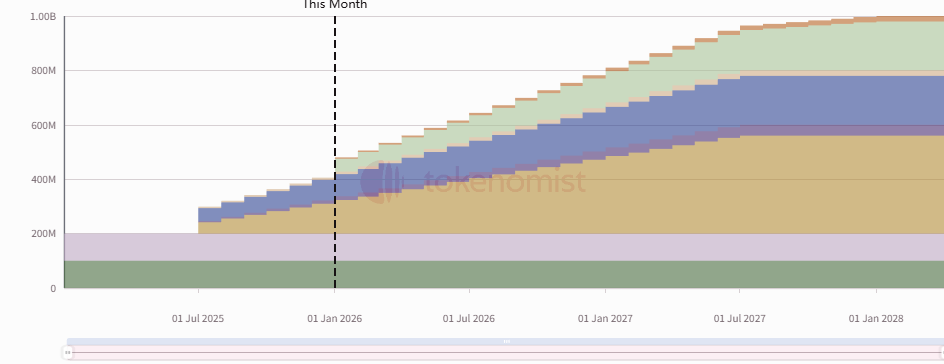 在业务转型前,项目通过Coinlist平台完成了ONDO代币的公开发售。当时购买的代币均设定了为期一年的锁定期,并在此后按月度逐步释放。持有ONDO代币的用户可将其用于治理投票,特别是在其关联协议Flux Finance中行使治理权。下方图表展示了其详细的代币释放时间表。