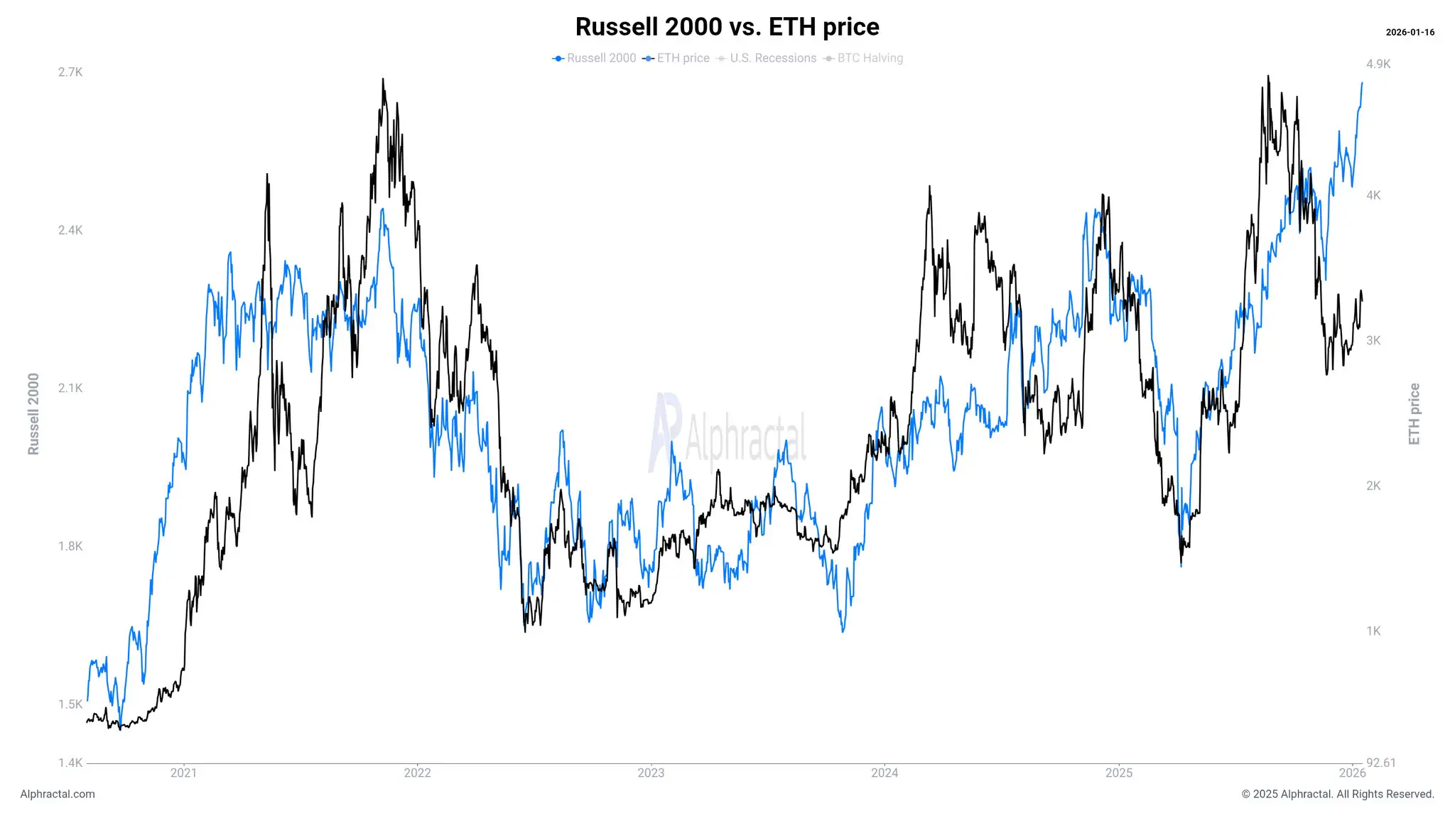 以太坊与美国小盘股(以罗素2000指数为代表)的同步波动关系正在减弱,这引发了市场对传统风险指标在当前宏观经济转型期有效性的新思考。