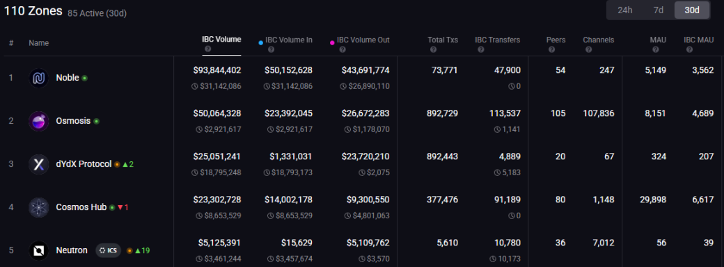 Noble在Cosmos生态内的地位堪称“流动性心脏”。数据显示,其近30天通过IBC协议转移的资产价值高达9384万美元,几乎是第二名Osmosis的两倍。在IBC网络连接的百余条链中,Noble贡献了断层式的资金流量。