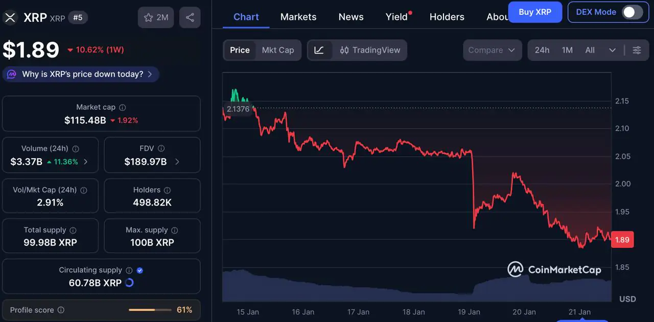1月19日,受“格陵兰冲击”影响,XRP价格暴跌至1.84美元,导致大量清算。尽管随后回升至1.98美元并形成看涨锤头线,但价格仍低于2.35美元的关键阻力位,趋势依然看跌。市场能否由熊转牛,取决于其能否守住1.90美元附近的支撑。