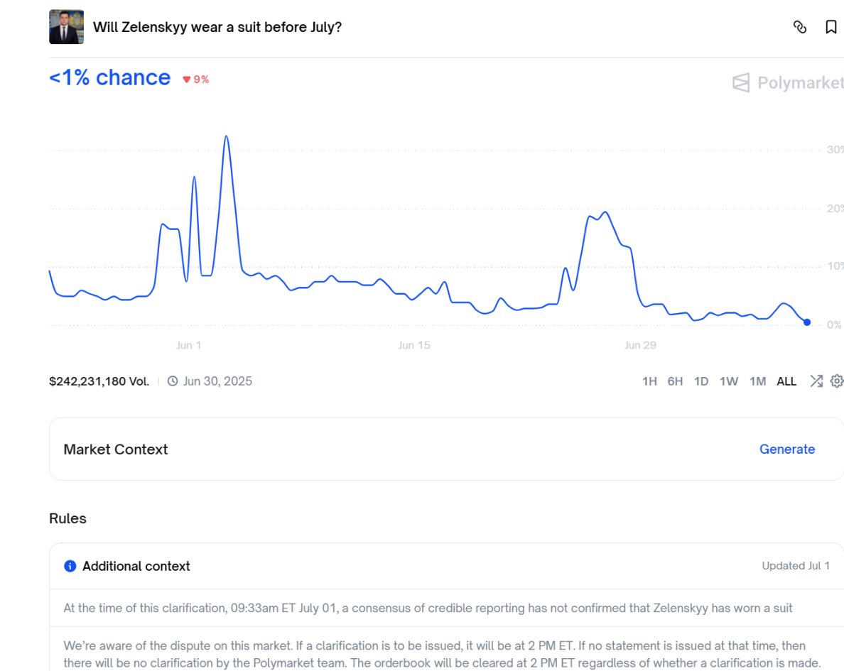 一个典型案例是此前关于乌克兰总统泽连斯基着装风格的预测。尽管主流媒体与时尚界普遍认定其出席活动时所穿为西装,但这一结论在Polymarket平台上却引发了剧烈波动。巨额资金在“是”与“否”之间博弈,结算过程漫长且充满不确定性。