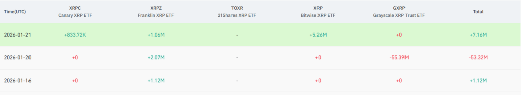 1月16日至21日XRP ETF资金流动。数据来源:Coinglass