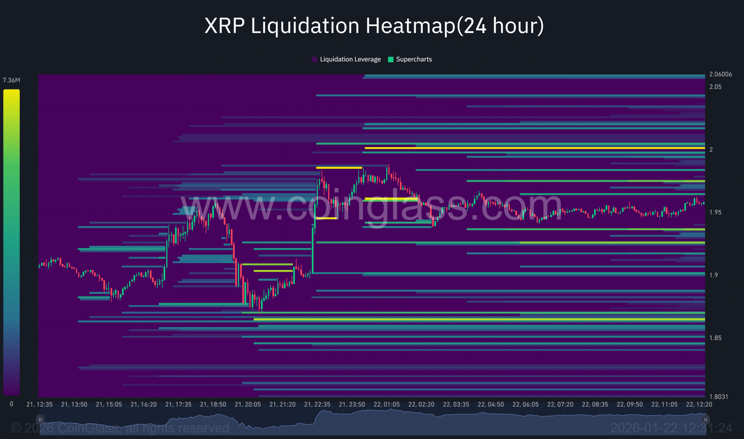 热图数据显示,1.98美元至2.05美元区间存在密集的清算集群,尤其是略高于2.00美元的区域。当前价格在1.95美元附近盘整,但下方至1.90美元的卖压有限。