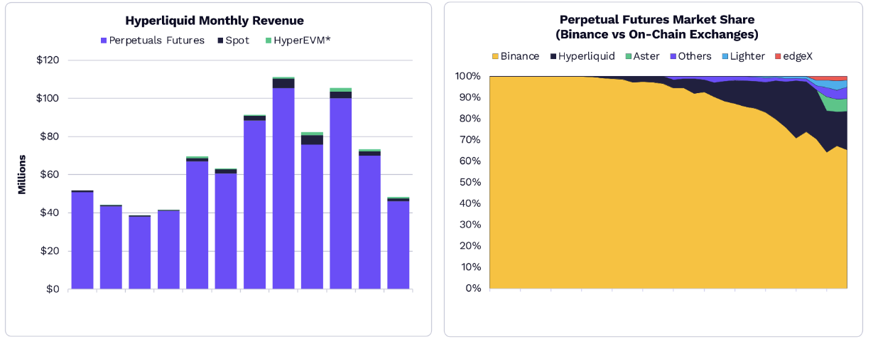 DeFi协议在资本效率和组织生产力上展现出惊人优势。例如,去中心化衍生品交易所Hyperliquid在员工不足15人的情况下,实现了超过8亿美元的年收入。这凸显了永续合约、稳定币和Meme币等链上垂直领域已形成明确的产品市场契合度。