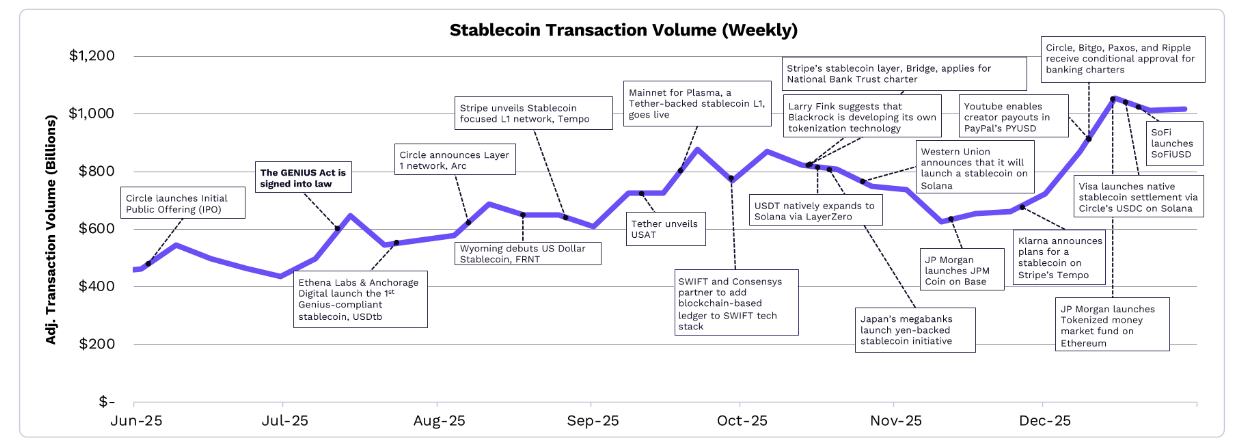 随着美国《GENIUS Act》为稳定币提供监管框架,金融机构正积极布局稳定币与资产代币化战略。这一趋势已推动稳定币交易量在2025年12月达到3.5万亿美元的月度峰值,是Visa、PayPal及传统汇款交易量总和的两倍以上。