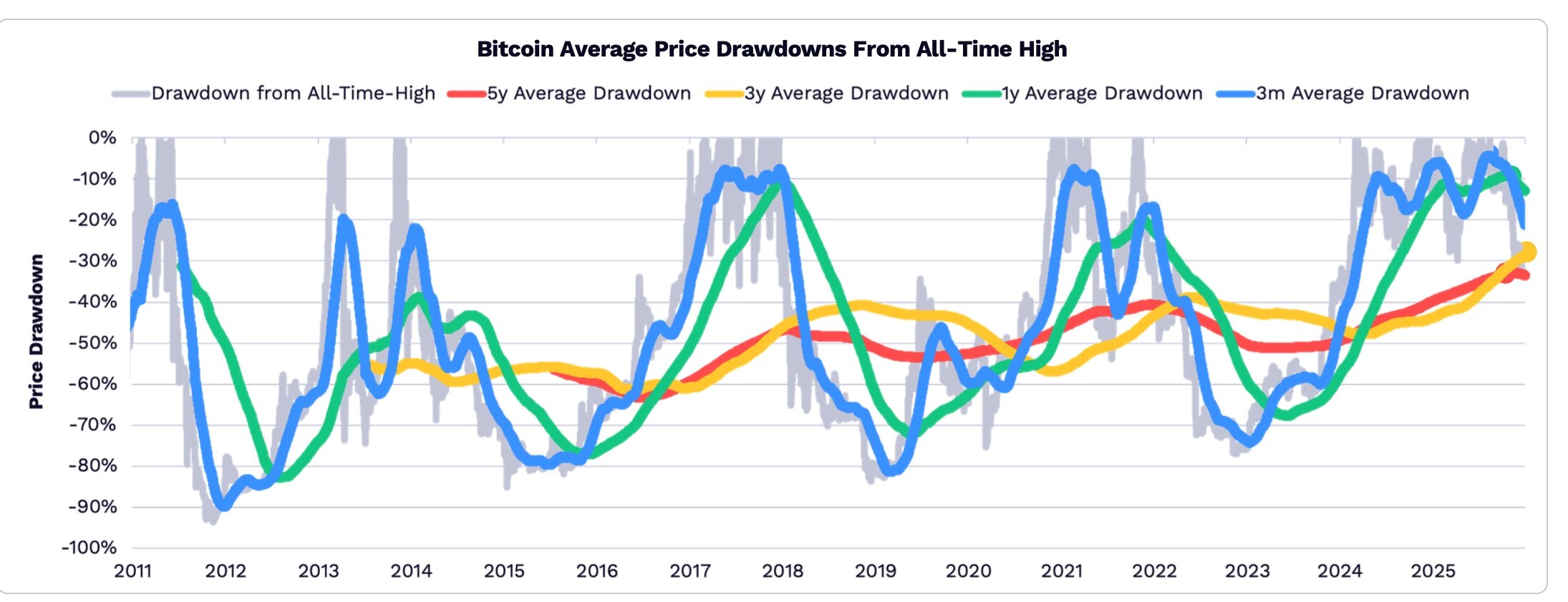 另一个积极信号是比特币价格波动性的降低。从5年、3年、1年及3个月的不同时间维度观察,2025年比特币的价格回撤幅度均小于历史周期,表明其作为“数字黄金”的避险属性正在增强,市场结构趋于稳健。