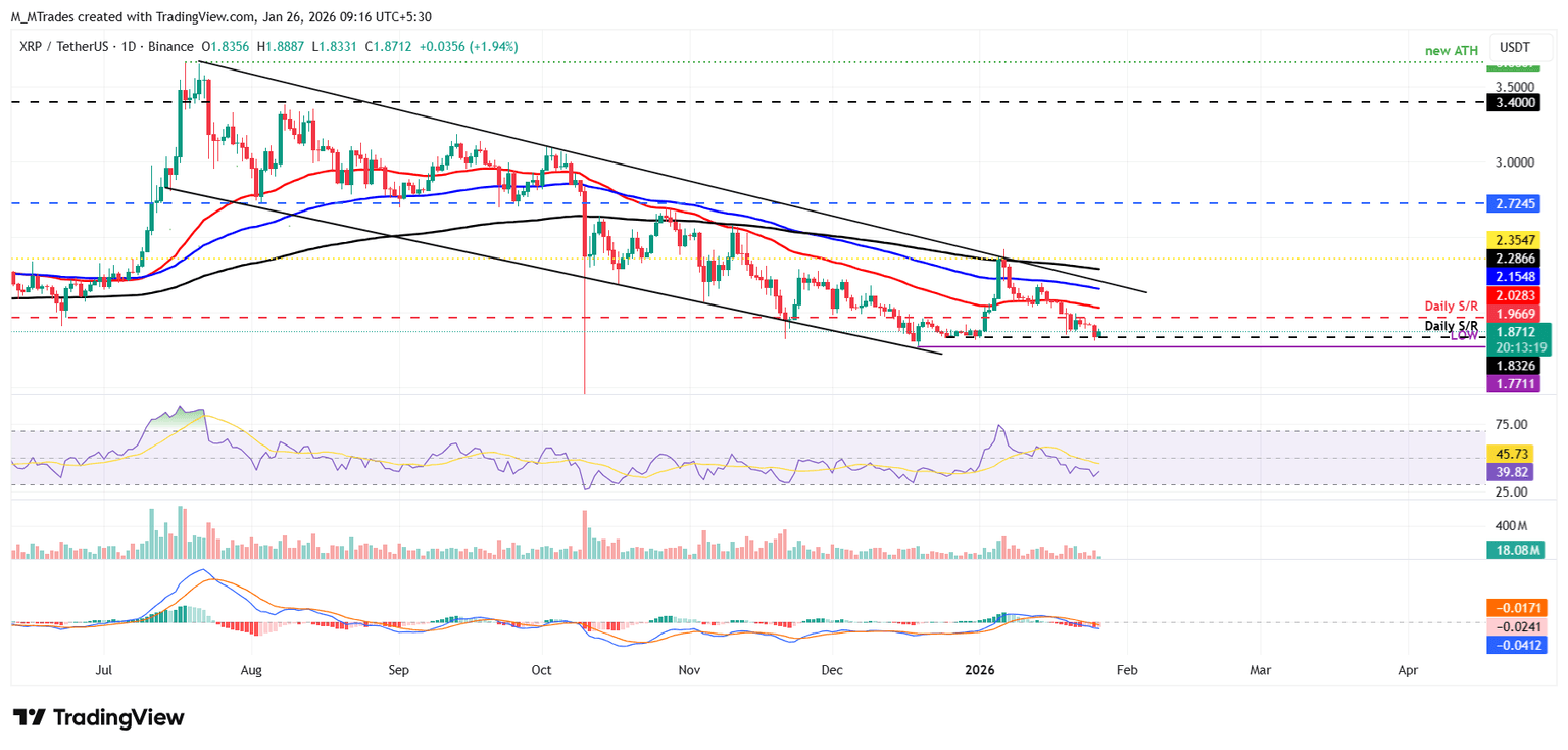 瑞波币(XRP)价格在三周内下跌超12%后,于周日重新测试了1.83美元的日线支撑位,随后小幅反弹至1.87美元附近。