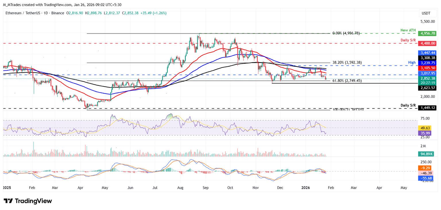 以太坊(ETH)价格在跌破3,017美元支撑后,目前交易于2,852美元附近,正接近2,749美元的关键支撑位。
