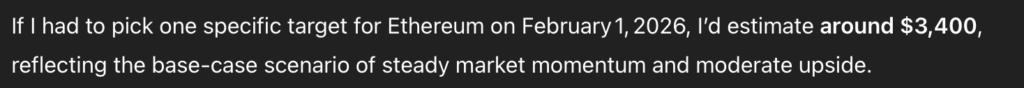 人工智能ChatGPT对以太坊(ETH)价格进行了预测。在基本市场情况下,预计到2026年2月1日,ETH价格可能达到**3400美元**左右,较当前价格有约17%的上涨空间。