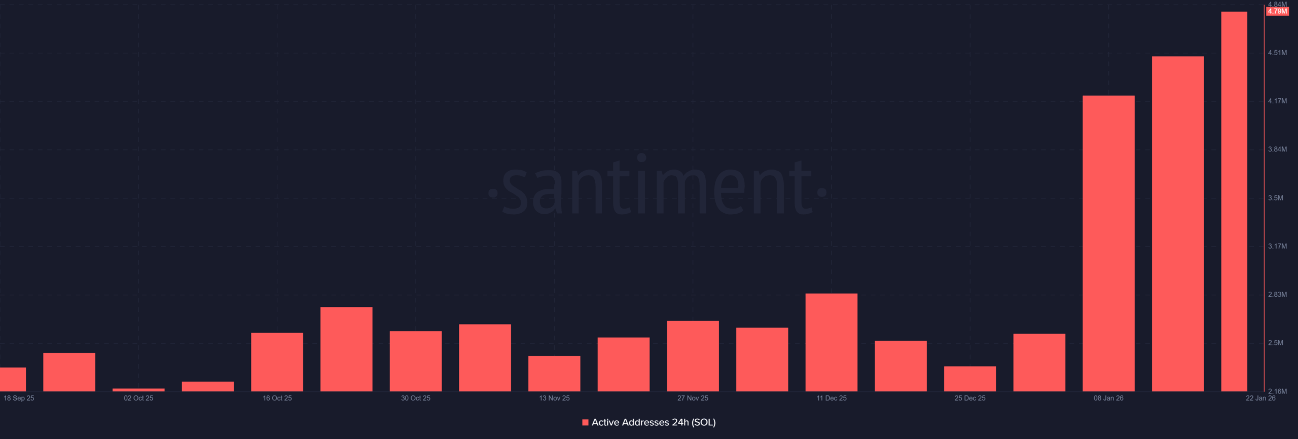 根据Santiment链上数据,自2026年初以来,Solana网络的活跃地址数量从250万大幅增长至480万,几乎翻倍。