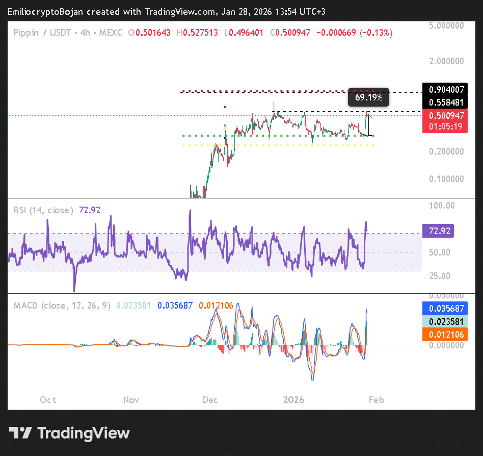 目前PIPPIN交易价格位于50%斐波那契回撤位上方,接近其历史高点0.71美元。