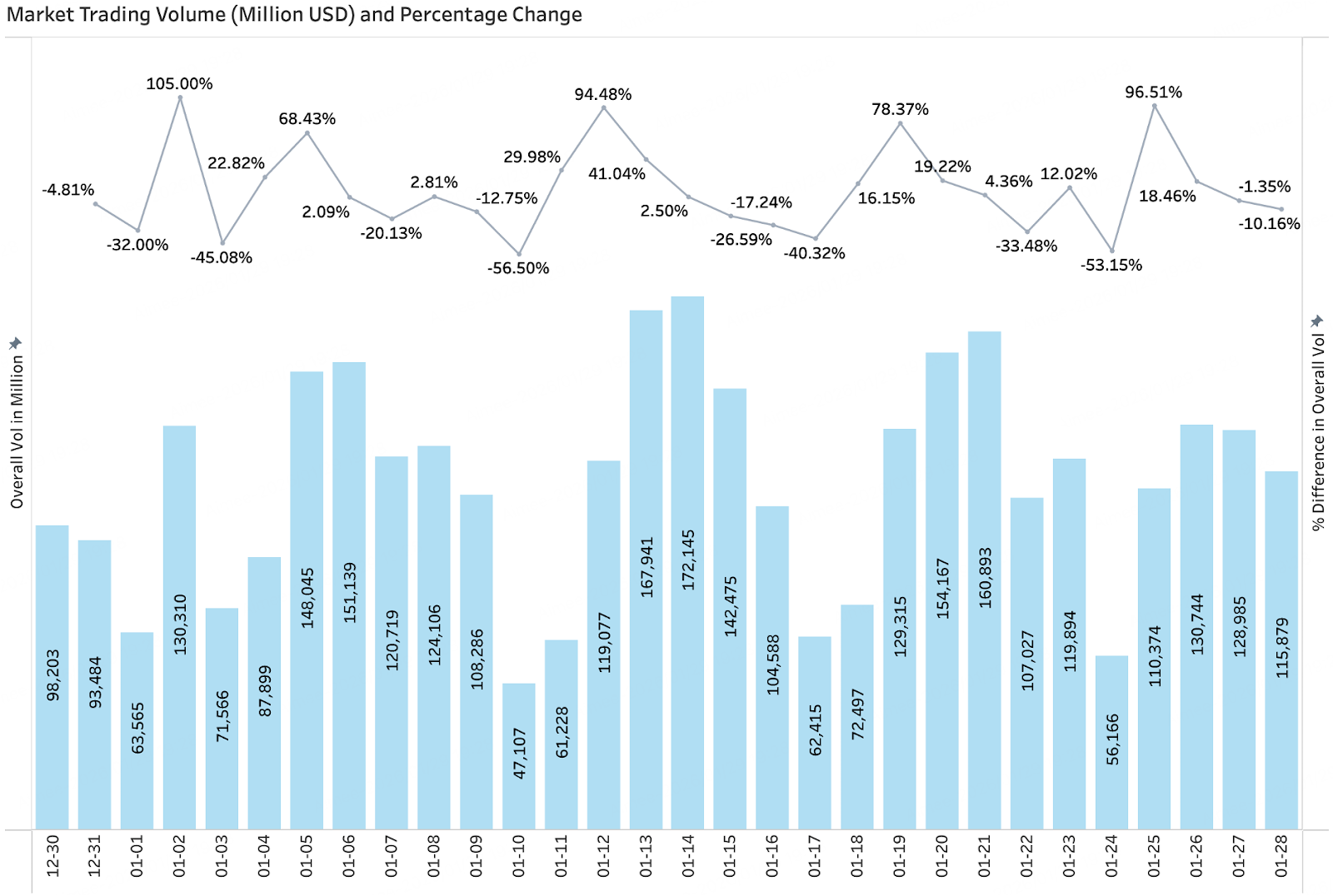 根据CoinGecko统计数据,1月全市场日均交易量在1100亿至1600亿美元之间宽幅波动。成交量多次出现脉冲式放大,但未能形成持续放量趋势,这揭示了市场主要由短期交易与事件驱动,缺乏中长期资金的坚定入场。