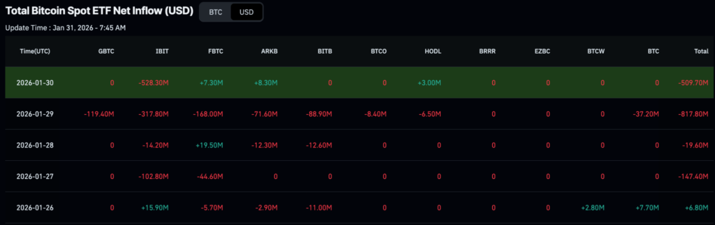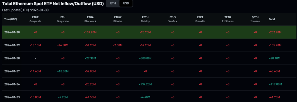 - 抛售在周后期加剧:1月29日净流出3.18亿美元,1月30日净流出高达5.28亿美元。