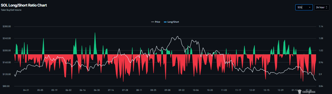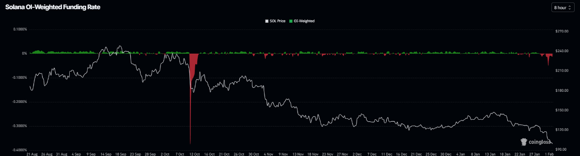 Solana(SOL)衍生品数据强化了市场的看跌情绪。Coinglass数据显示,其加权融资利率已转为负值(-0.0080%),表明空头头寸占优,且空头需向多头支付费用。同时,SOL的多空比率降至0.97(低于1),进一步证实了市场参与者对价格下跌的押注更为集中。