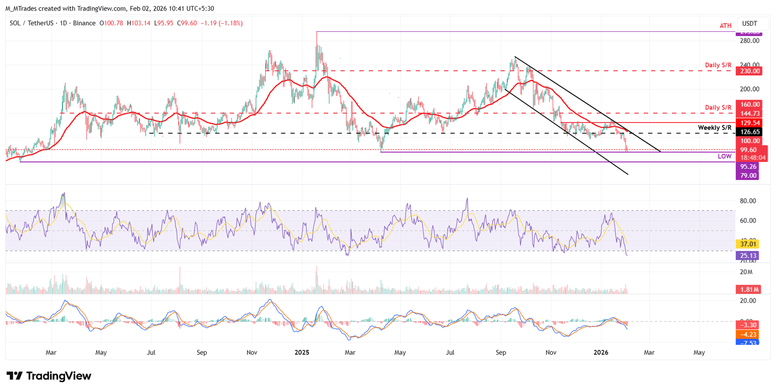 SOL价格在未能突破126.65美元的周线阻力位后持续下跌,目前已跌破100美元关键心理关口。若日线收盘价稳定低于100美元,下行风险将增大,可能进一步测试95.26美元(4月7日低点)乃至79美元(1月23日低点)的支撑。