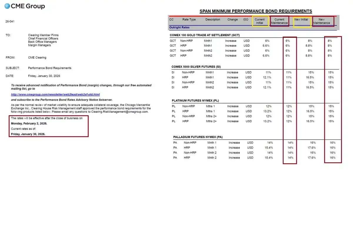 随着价格暴跌,芝加哥商品交易所(CME)紧急上调了黄金与白银期货的保证金要求。以白银为例,非高风险账户的保证金比例从11%提高至15%。此举导致资金不足的交易者被强制平仓,大量卖盘涌出形成价格下跌与抛售加剧的恶性循环。据统计,仅代币化期货产品在24小时内的爆仓金额就高达1.4亿美元。