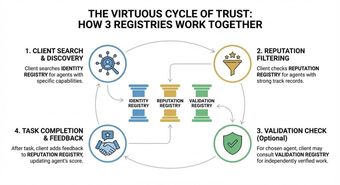 ERC-8004正是为此而生。它通过构建一套最小化的“社会结构”,试图让AI Agent像人类社会成员一样,拥有身份、积累声誉并承担责任: