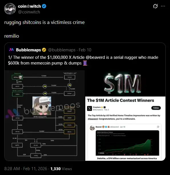 然而,正当加密社区为此庆祝时,区块链分析机构Bubblemaps发布的一项指控,却展现了Beaver截然不同的另一面。该机构通过链上数据分析指出,Beaver可能是一个“连环发盘手”,其关联地址曾发行并操控某个迷因币,导致该币种在短时间内暴涨后迅速归零,并从中获利约60万美元。