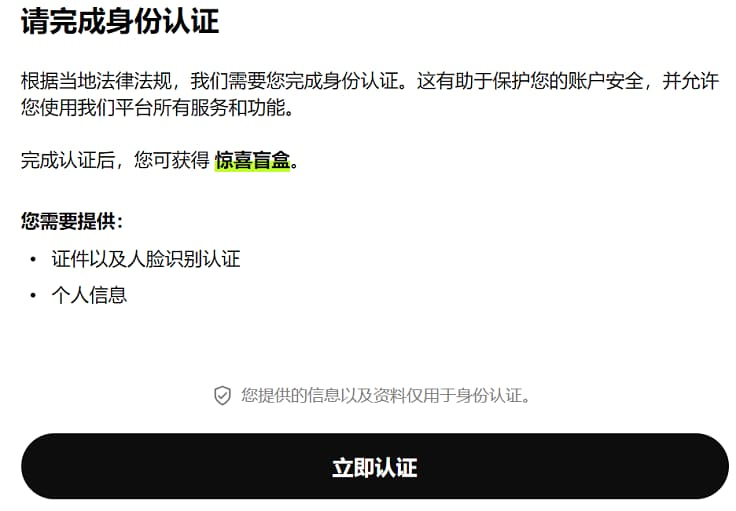 现在,完成身份认证,有机会获取随机惊喜盲盒。