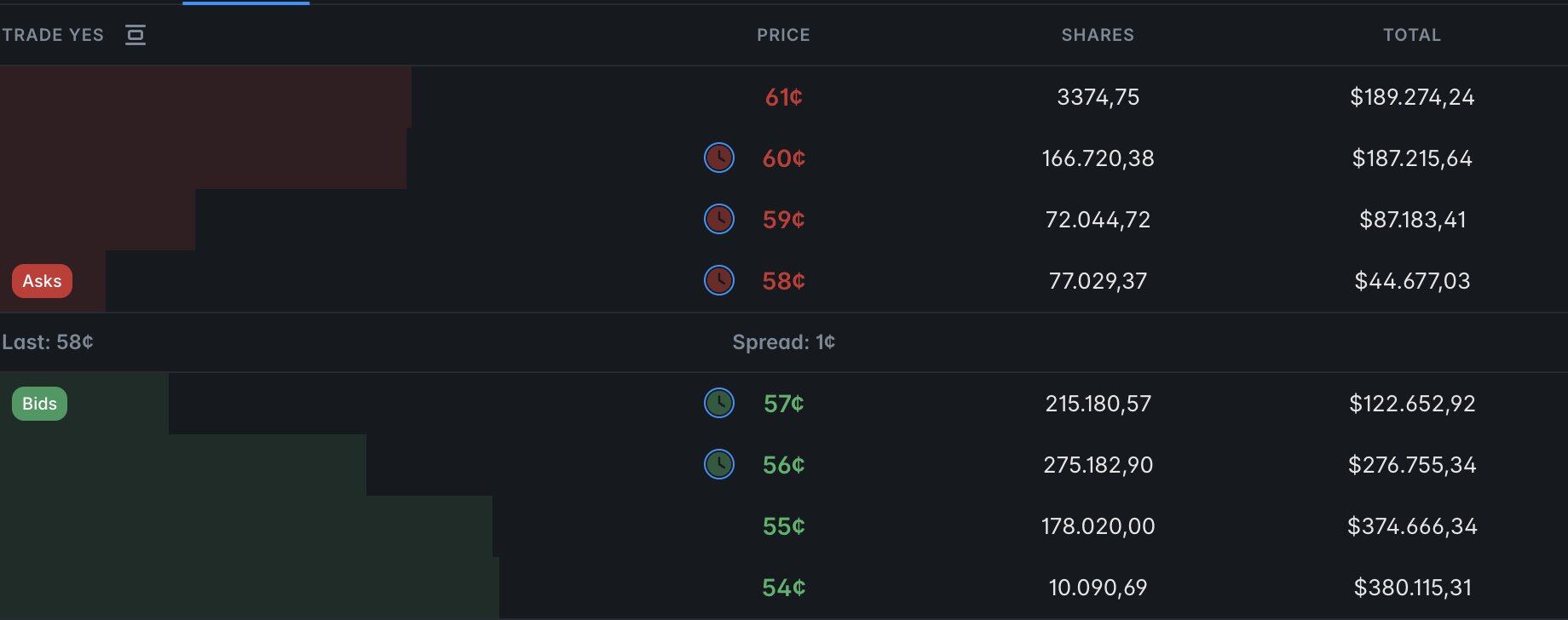 始终在“YES”(是)和“NO”(否)两侧同时挂出限价订单,并围绕中间价对称分布。核心目标在于赚取买卖价差和激励奖励,并维持LP资格,而非进行方向性投机。