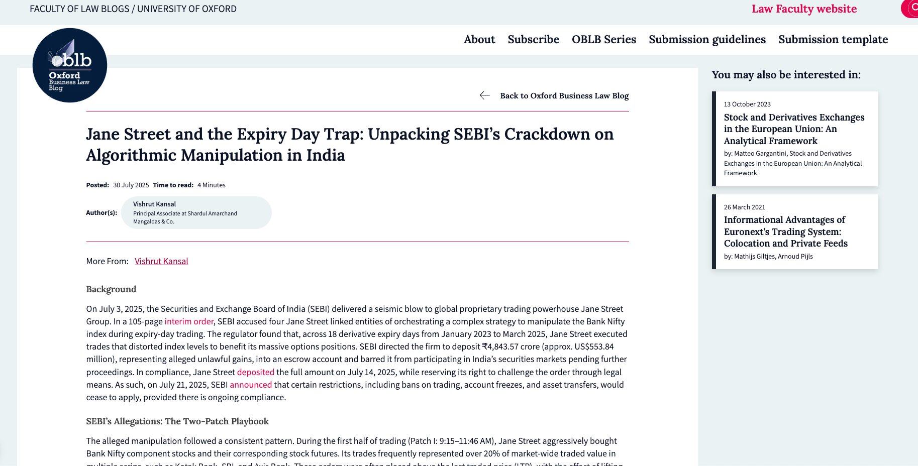 SEBI评估其非法获利约58亿美元,并严厉谴责其行为“蓄意操纵结算价格”。Jane Street已被禁止进入印度市场,案件仍在审理中。